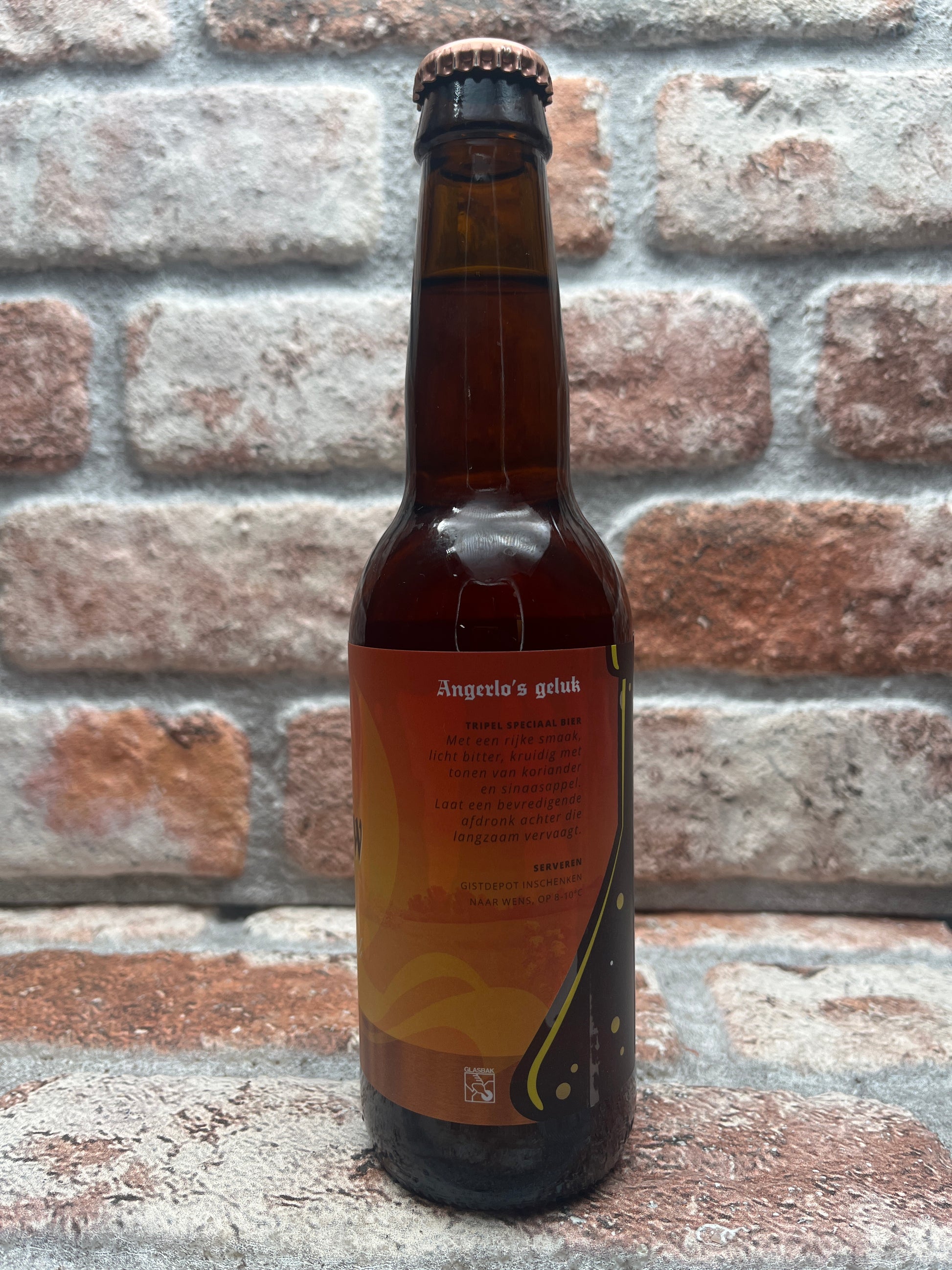 LaBrew Angerlos Geluk ist ein reichhaltiges Tripel, leicht bitter mit würzigen Noten von Koriander und Orange. Es hinterlässt einen angenehmen Abgang, der langsam abklingt.